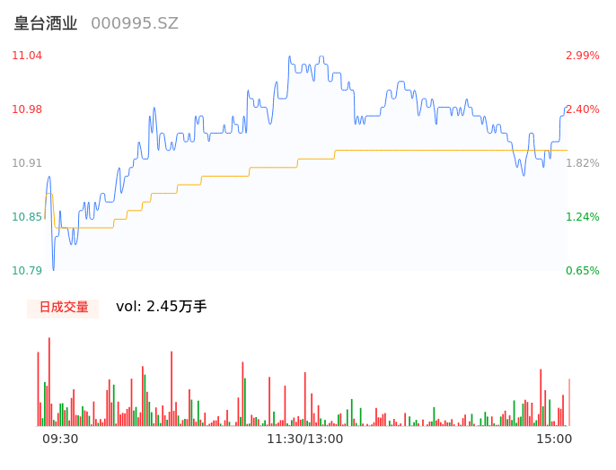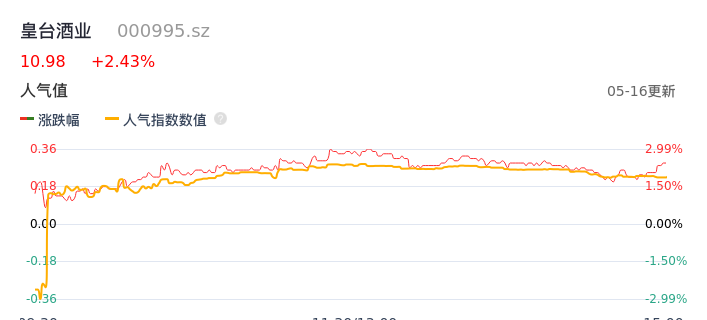 05月16日,皇台酒业收报10.98,股价涨幅2.43%,成交金额2673.43万元,换手率1.38%。