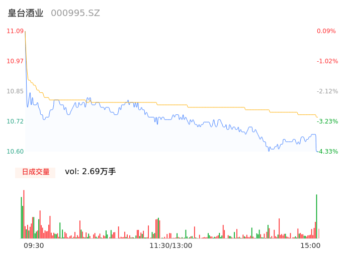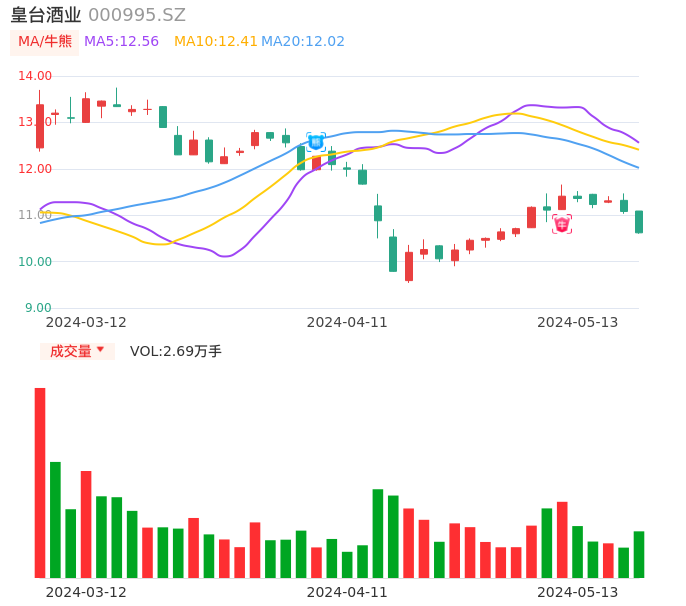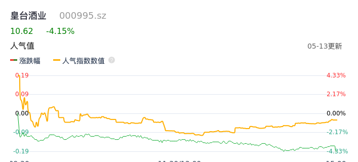 05月13日,皇台酒业收报10.62,股价涨幅-4.15%,成交金额2891.26万元,换手率1.52%。