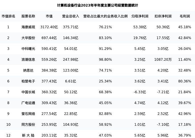 新大陆最新报告期数据为半年度,下表汇总了计算机设备行业内市值靠前的公司半年度主要经营数据