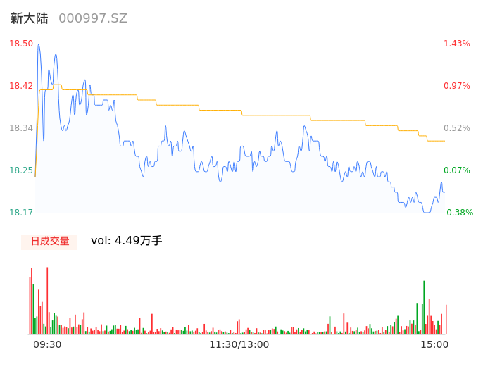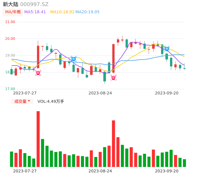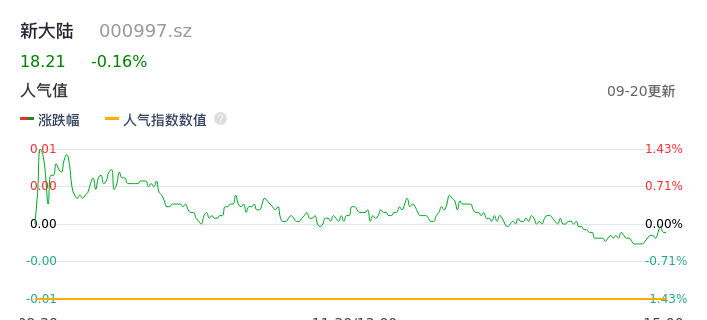 09月20日,新大陆收报18.21,股价涨幅-0.16%,成交金额8213.00万元,换手率0.44%。