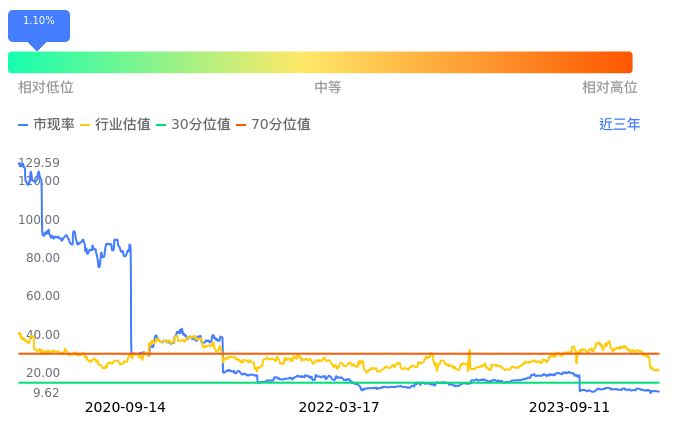 2023年09月11日,新大陆上涨1.60%收于19.68,今日成交金额1.98亿元。下文将从市盈率PETTM、市净率PB、市现率3个角度去分析公司估值情况。