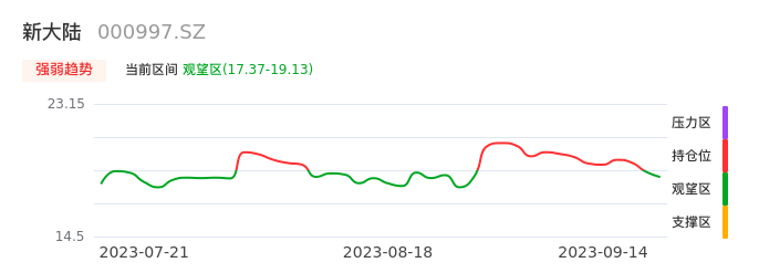 我们来看一下该股的九方特色指标强弱趋势的情况:新大陆近日从持仓区下穿到观望区,股价出现持续性调整行情。短期已经转为空头行情,且下跌动能仍未衰竭。建议继续谨慎观望。