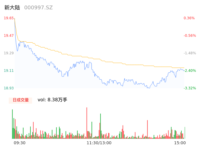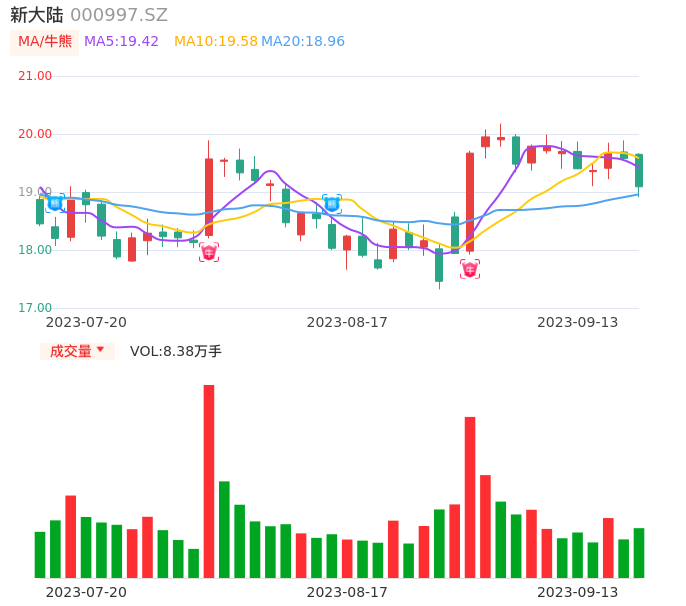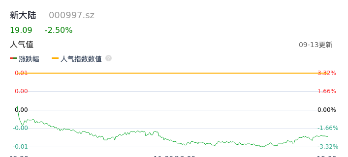 09月13日,新大陆收报19.09,股价涨幅-2.50%,成交金额1.60亿元,换手率0.82%。