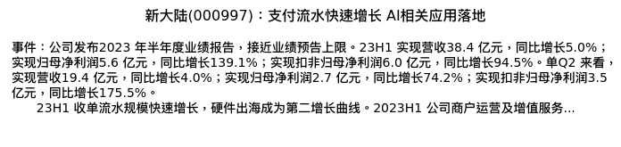 值得注意的是:2023年09月西南证券的王湘杰分析师,首次发布关于新大陆的研究报告,标题为:新大陆(000997):支付流水快速增长 AI相关应用落地。