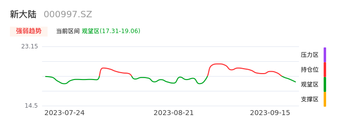 我们来看一下该股的九方特色指标强弱趋势的情况:新大陆近日从持仓区下穿到观望区,股价出现持续性调整行情。短期已经转为空头行情,且下跌动能仍未衰竭。建议继续谨慎观望。