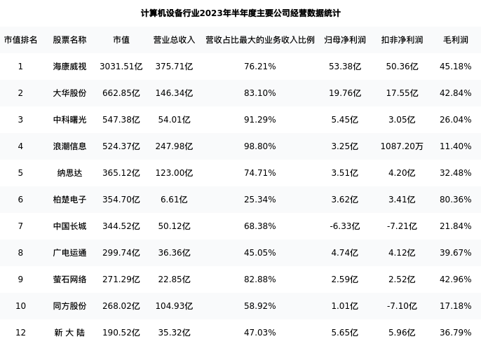 新大陆最新报告期数据为半年度,下表汇总了计算机设备行业内市值靠前的公司半年度主要经营数据