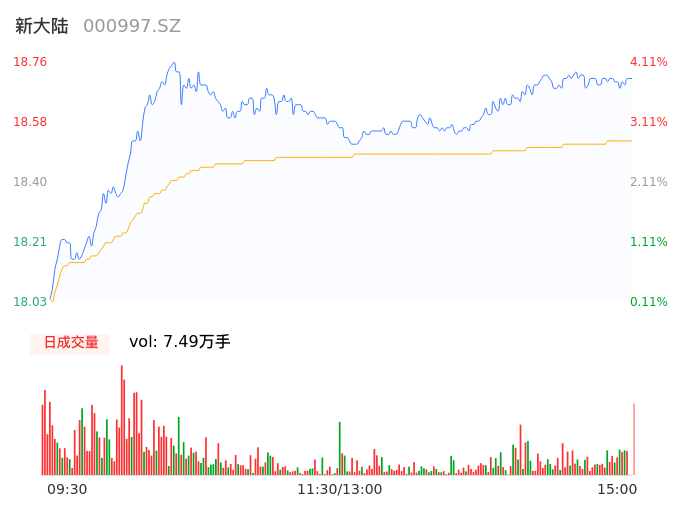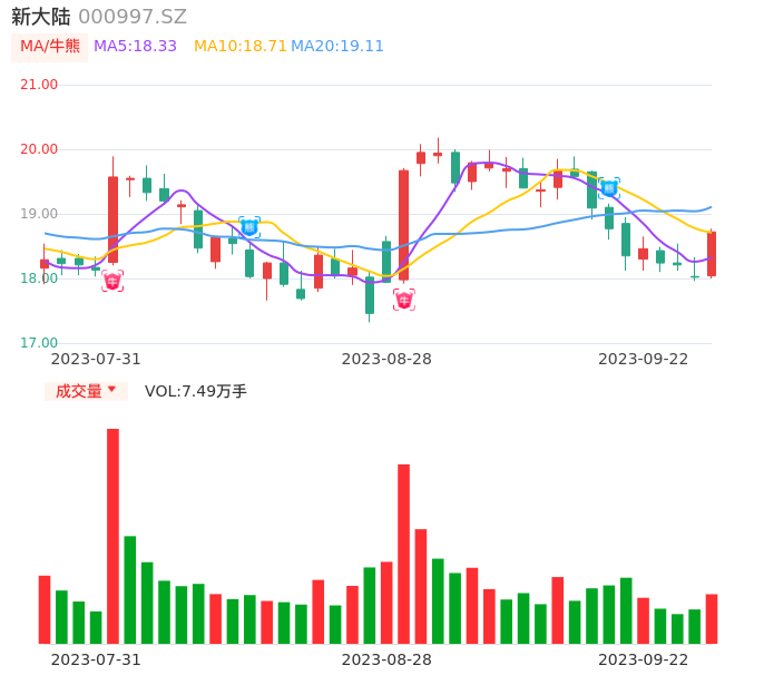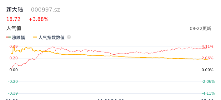 09月22日,新大陆收报18.72,股价涨幅3.88%,成交金额1.39亿元,换手率0.73%。