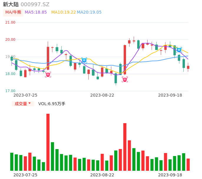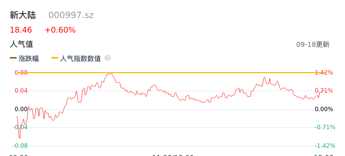 09月18日,新大陆收报18.46,股价涨幅0.60%,成交金额1.28亿元,换手率0.68%。