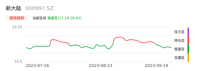 我们来看一下该股的九方特色指标强弱趋势的情况:新大陆自09月13日从持仓区下穿到观望区,股价近期持续走弱。短期已经进入空头行情,且下跌动能仍未衰竭。建议继续谨慎观望。