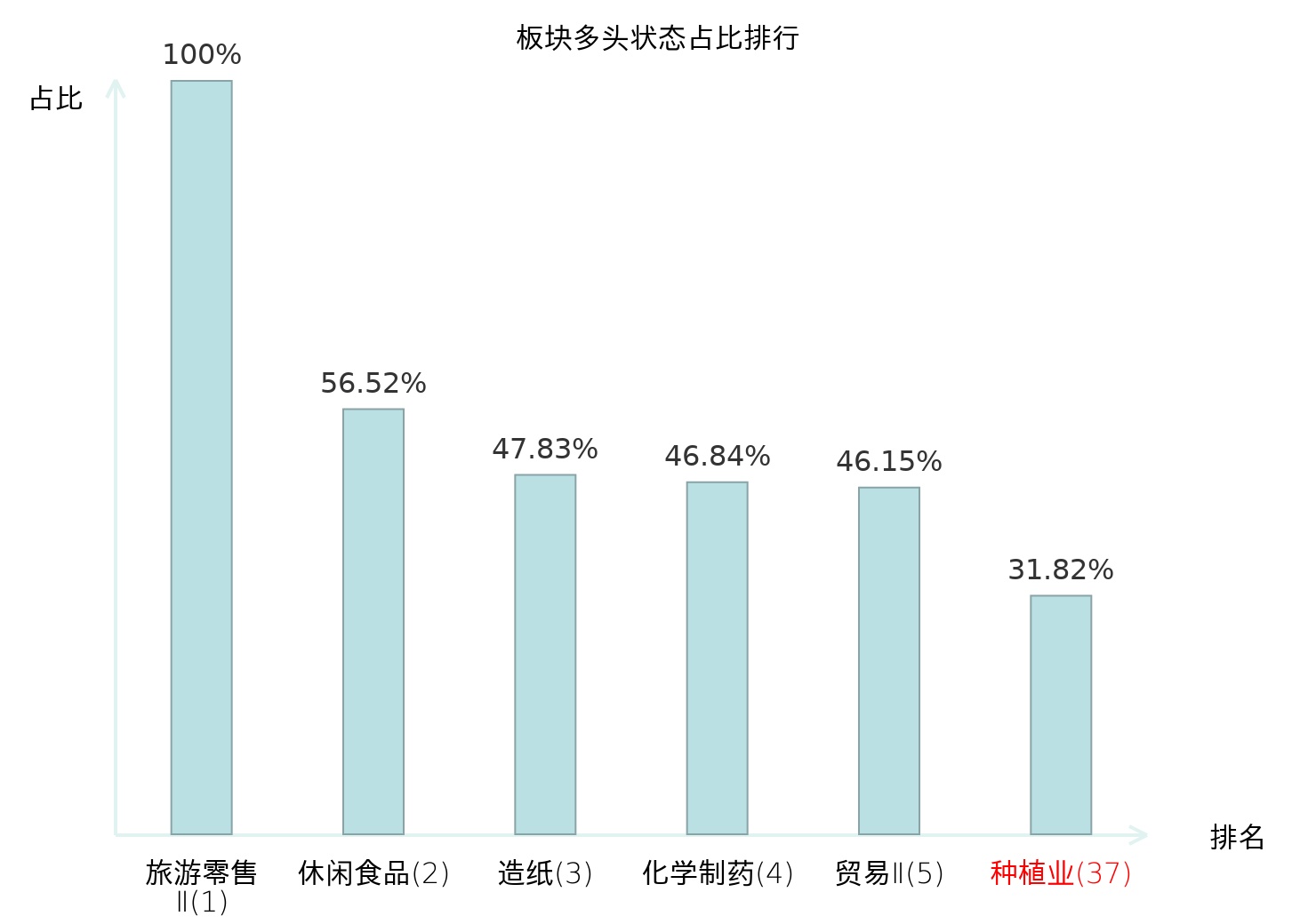 全市场所有行业板块中主力多头状态占比排名中,旅游零售Ⅱ板块位居第一。动物保健Ⅱ板块名次提升最快,较昨日上升58位。