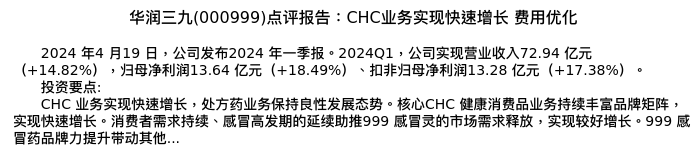 值得注意的是:2024年04月万联证券的黄婧婧分析师,首次发布关于华润三九的研究报告,标题为:华润三九(000999)点评报告:CHC业务实现快速增长 费用优化。