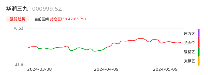 我们来看一下该股的九方特色指标强弱趋势的情况:华润三九自04月10日从观望区上穿到持仓区。股价近期在多头区域回调整理。后续重点关注多空分界点的争夺:58.42元。如未能有效站稳则可能重新回到空头行情。