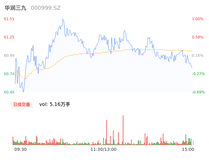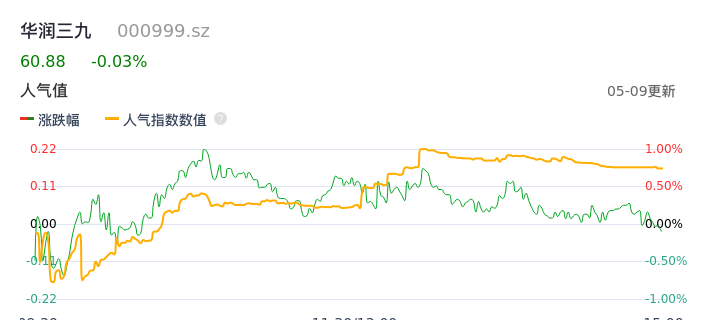 05月09日,华润三九收报60.88,股价涨幅-0.03%,成交金额3.15亿元,换手率0.53%。