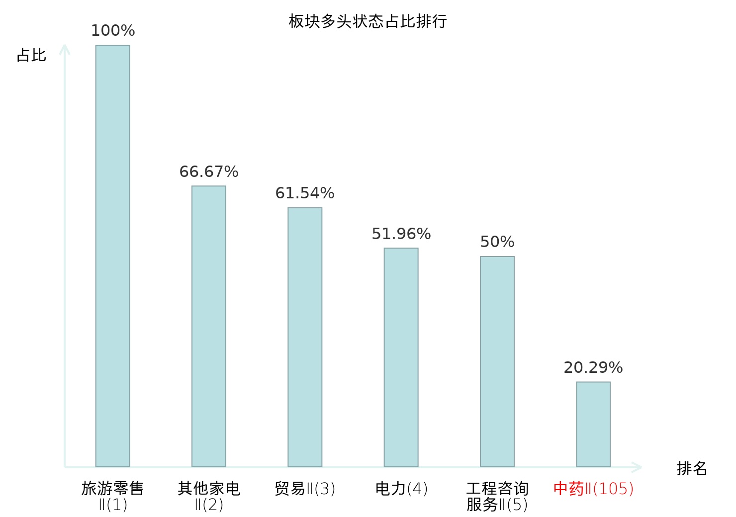全市场所有行业板块中主力多头状态占比排名中,旅游零售Ⅱ板块位居第一。文娱用品板块名次提升最快,较昨日上升84位。