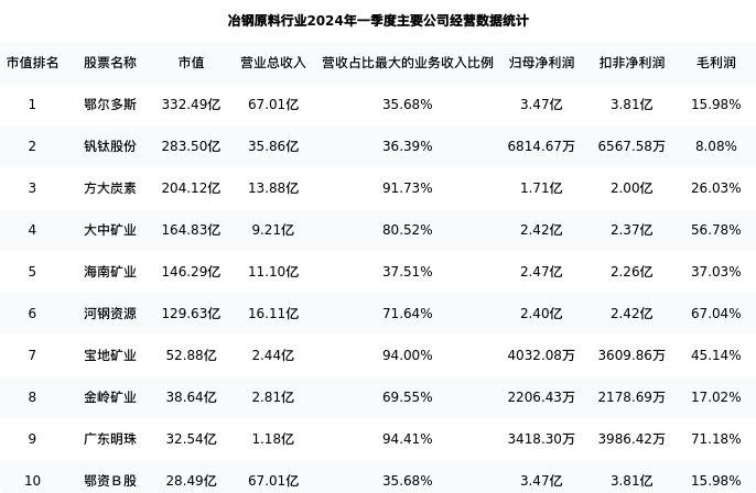 大中矿业最新报告期数据为一季度,下表汇总了冶钢原料行业内市值靠前的公司一季度主要经营数据
