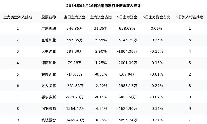 从主力资金流向来看,冶钢原料行业今日主力资金流入2.47亿元,在所有申万二级行业中排名:20/131。