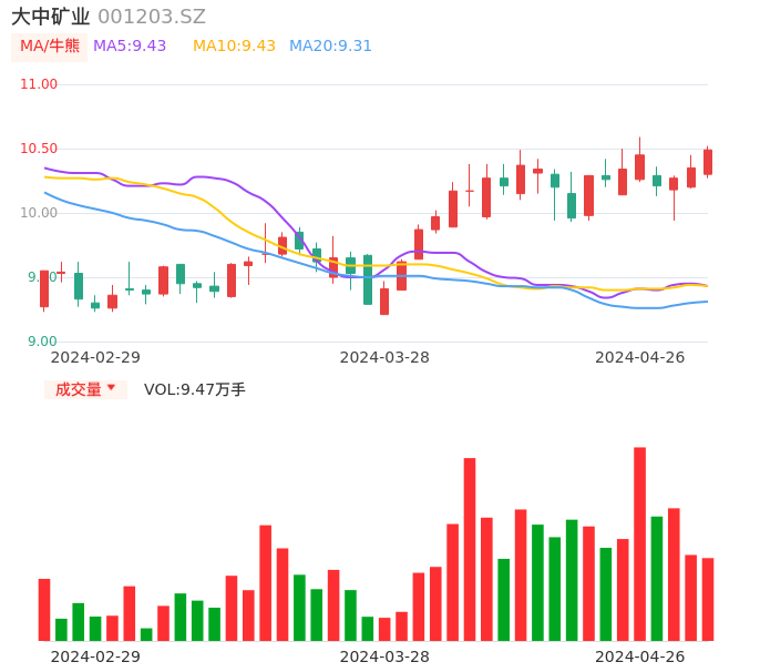 04月26日,大中矿业收报10.49,股价涨幅1.35%,成交金额9859.90万元,换手率2.18%。