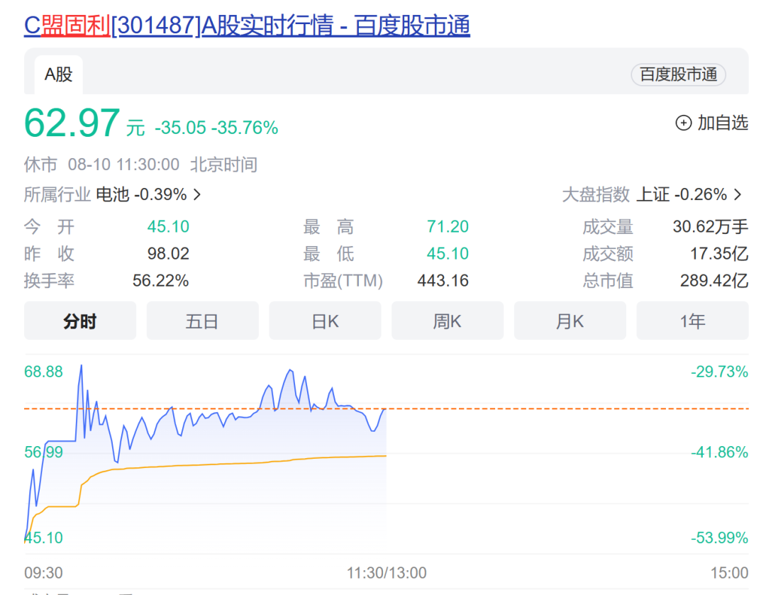 不过,盟固利早间开盘后跌幅收窄,并触发临停。截至午间收盘,盟固利下跌35.76%,收至62.97元/股。昨日上市的另两只新股威力传动、碧兴物联亦大幅下挫,跌幅分别为30.33%、24.26%。
