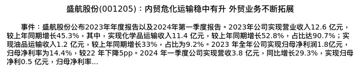 值得注意的是:2024年05月西南证券的胡光怿分析师,首次发布关于盛航股份的研究报告,标题为:盛航股份(001205):内贸危化运输稳中有升 外贸业务不断拓展。