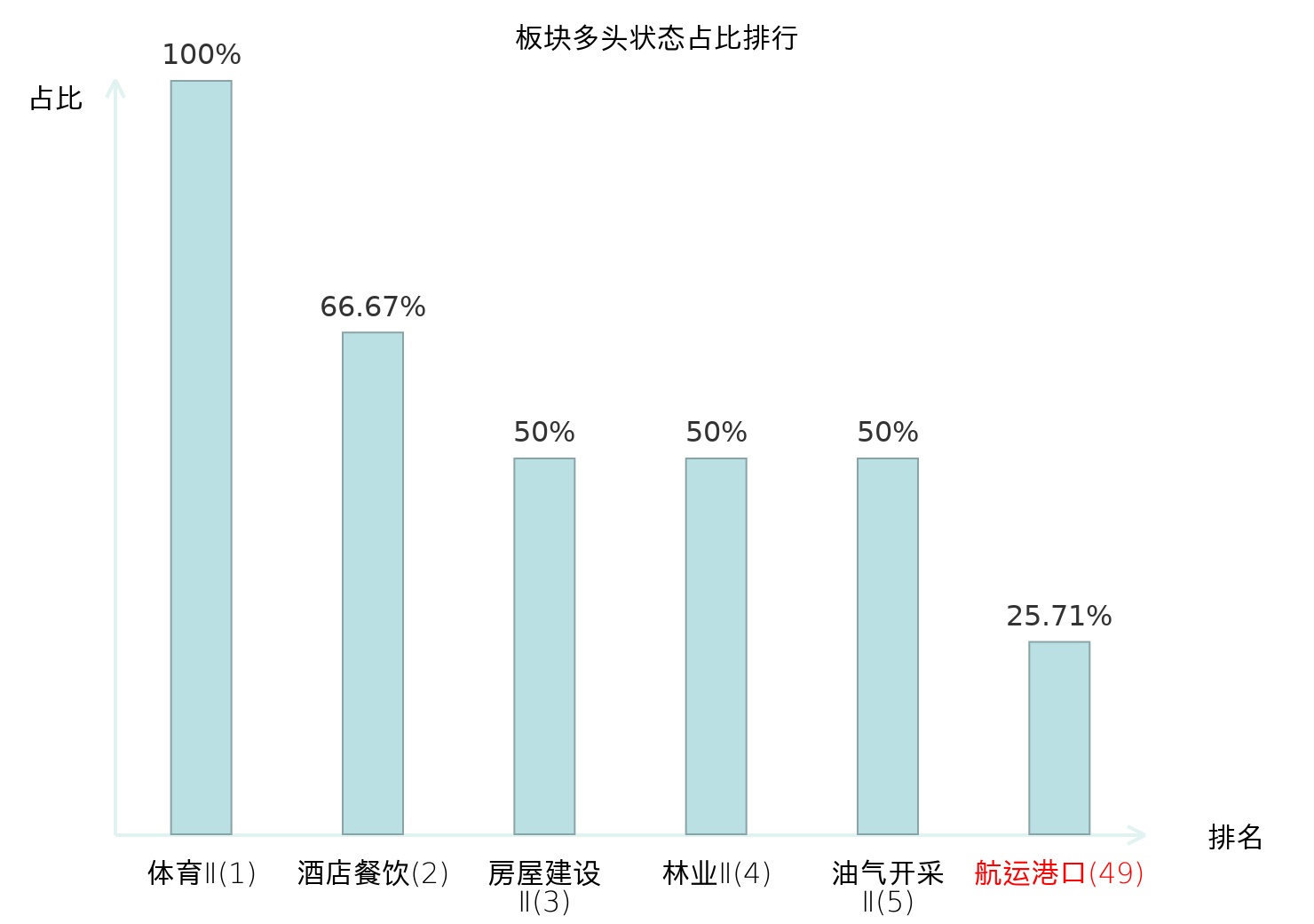全市场所有行业板块中主力多头状态占比排名中,体育Ⅱ板块位居第一。国有大型银行Ⅱ板块名次提升最快,较昨日上升100位。