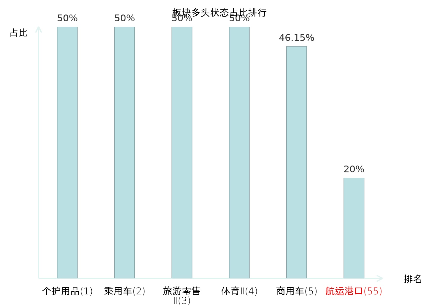 全市场所有行业板块中主力多头状态占比排名中,个护用品板块位居第一。林业Ⅱ板块名次提升最快,较昨日上升94位。