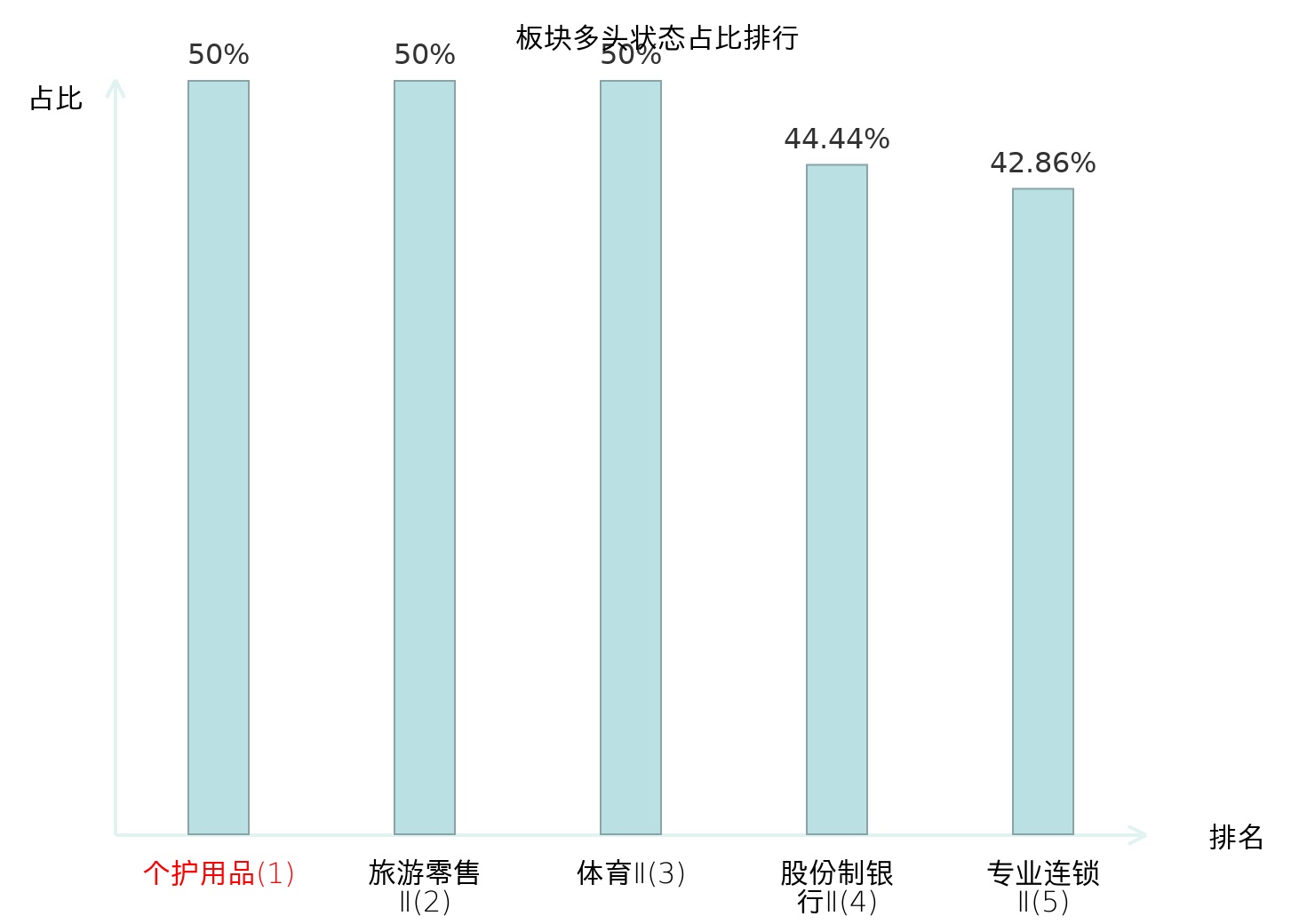 全市场所有行业板块中主力多头状态占比排名中,个护用品板块位居第一。非金属材料Ⅱ板块名次提升最快,较昨日上升37位。