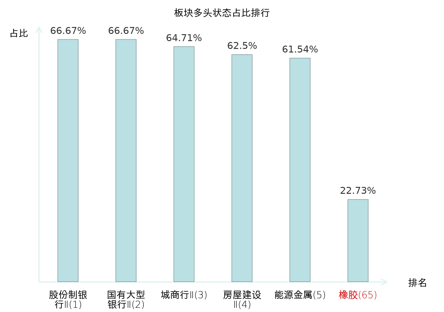 全市场所有行业板块中主力多头状态占比排名中,股份制银行Ⅱ板块位居第一。其他家电Ⅱ板块名次提升最快,较昨日上升102位。