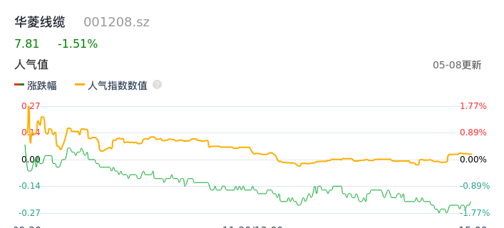 05月08日,华菱线缆收报7.81,股价涨幅-1.51%,成交金额3114.09万元,换手率1.60%。