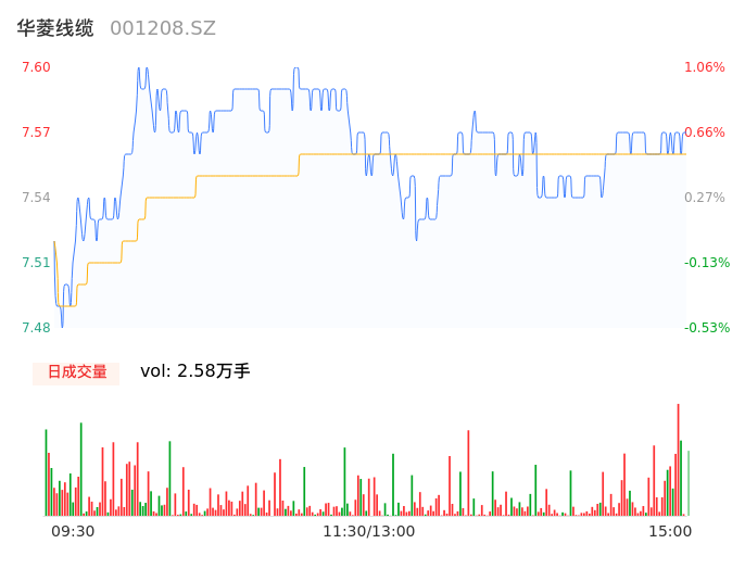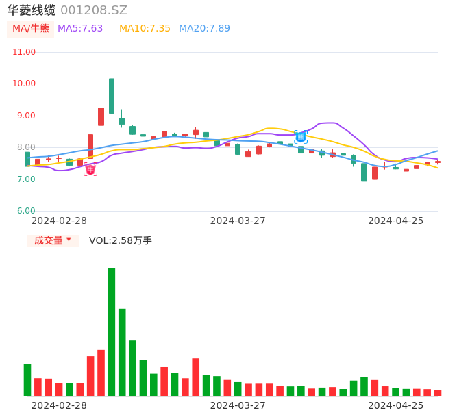 04月25日,华菱线缆收报7.56,股价涨幅0.53%,成交金额1947.36万元,换手率1.04%。