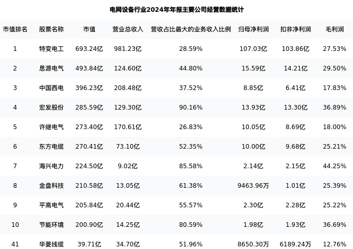 华菱线缆最新报告期数据为年报,下表汇总了电网设备行业内市值靠前的公司年报主要经营数据