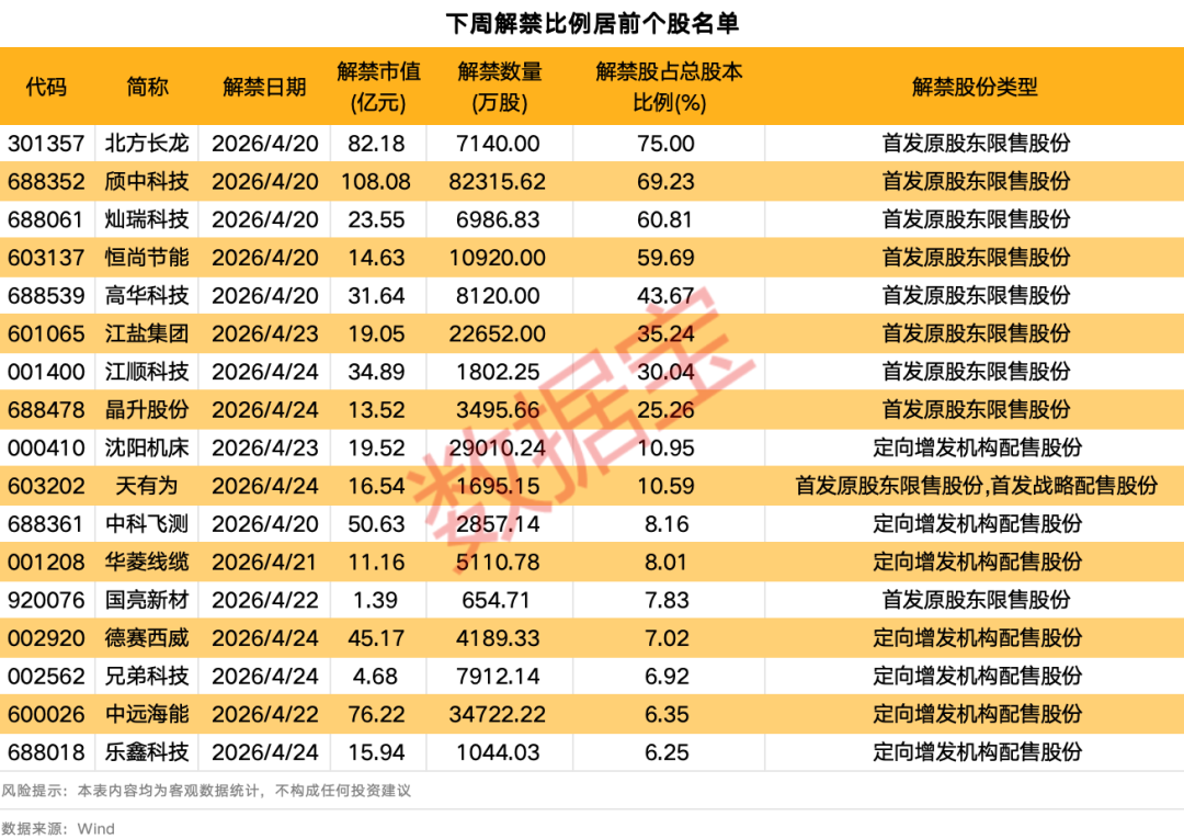 据证券时报·数据宝统计,下周(4月20日至24日),A股市场将有32家上市公司迎来限售股解禁。以个股最新价计算,32家上市公司解禁股对应市值合计约606.93亿元。