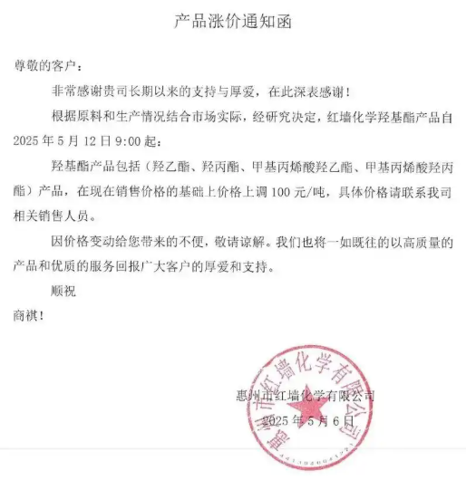 (2)羟基酯:上游环氧丙烷、丙烯酸价格上行,红墙股份、科隆股份宣布产品每吨提价100元。相关概念股:红墙股份、科隆股份。