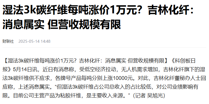 (1)湿法3K碳纤维:广泛应用于航空航天、无人机、风能等高新技术领域,随着无人机市场的不断扩大,吉林化纤湿法3K碳纤维每吨提价1万元。相关概念股:吉林化纤、中复神鹰、光威复材。