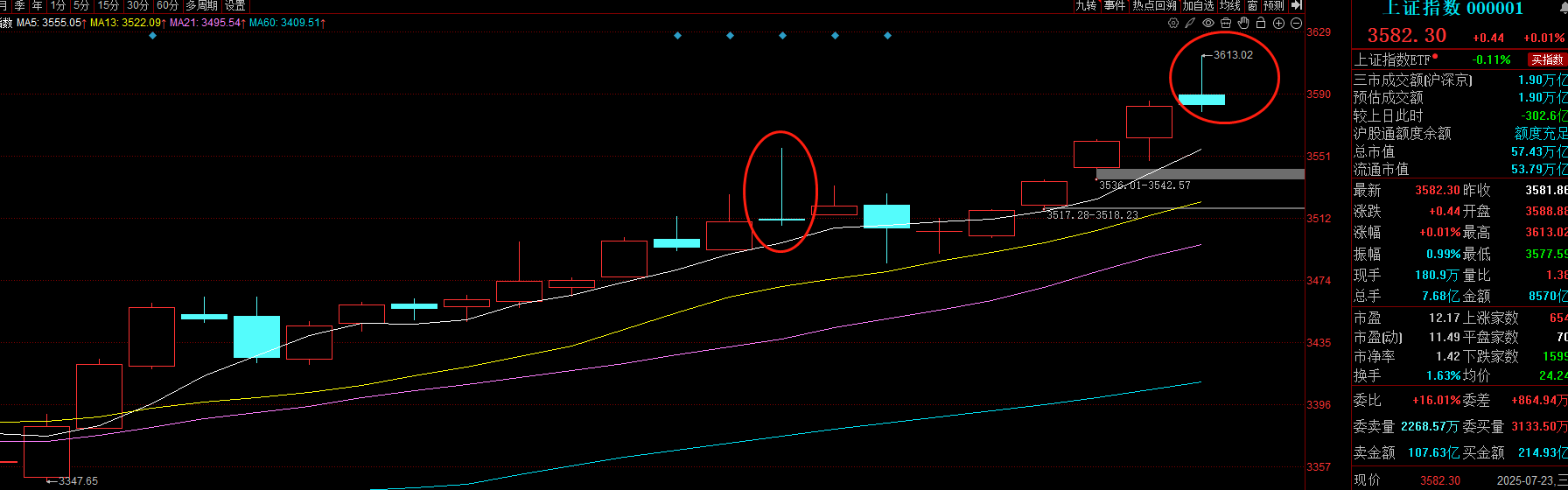 今天的倒垂阴线,无非是市场横盘两天休息一下,然后再向上突破。就跟7月11号一样。我为啥这么有信心呢?因为现在A股的资金是完全溢出的。