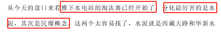 昨天今天雅下水电站是淘汰赛,水泥和民爆是最先被淘汰的。今天福建水泥、冀东水泥跌超9%,跌幅帮上一堆水泥股。而我给大家点到的几个有辨识度的公司,换手后都能上板,不坑人。这就是龙头的魅力。