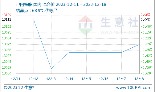 据生意社数据显示,12月11日国内液体己内酰胺市场均价为13112元/吨,12月18日国内液体己内酰胺市场均价为13075元/吨,本周己内酰胺价格下跌0.29%。生意社分析认为,近日己内酰胺市场价格行情小幅上涨,预计短期内会继续保持稳定向好态势。
