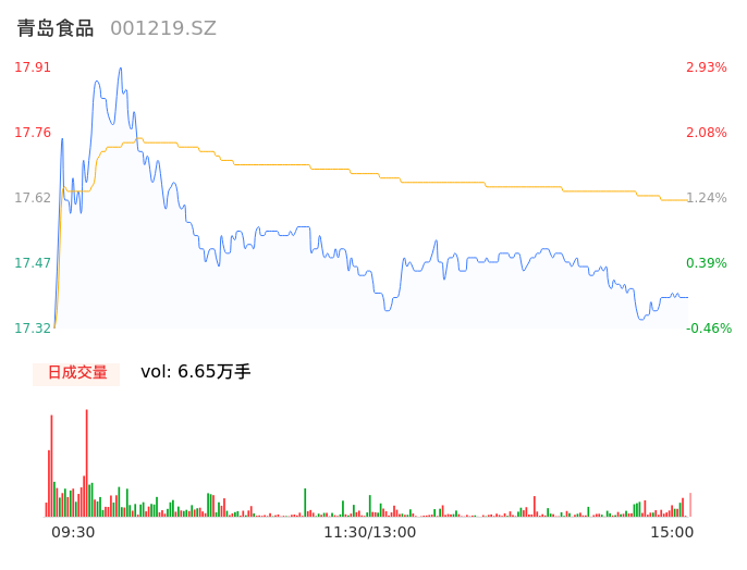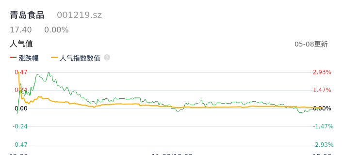 05月08日,青岛食品收报17.40,股价涨幅0.00%,成交金额1.17亿元,换手率8.77%。