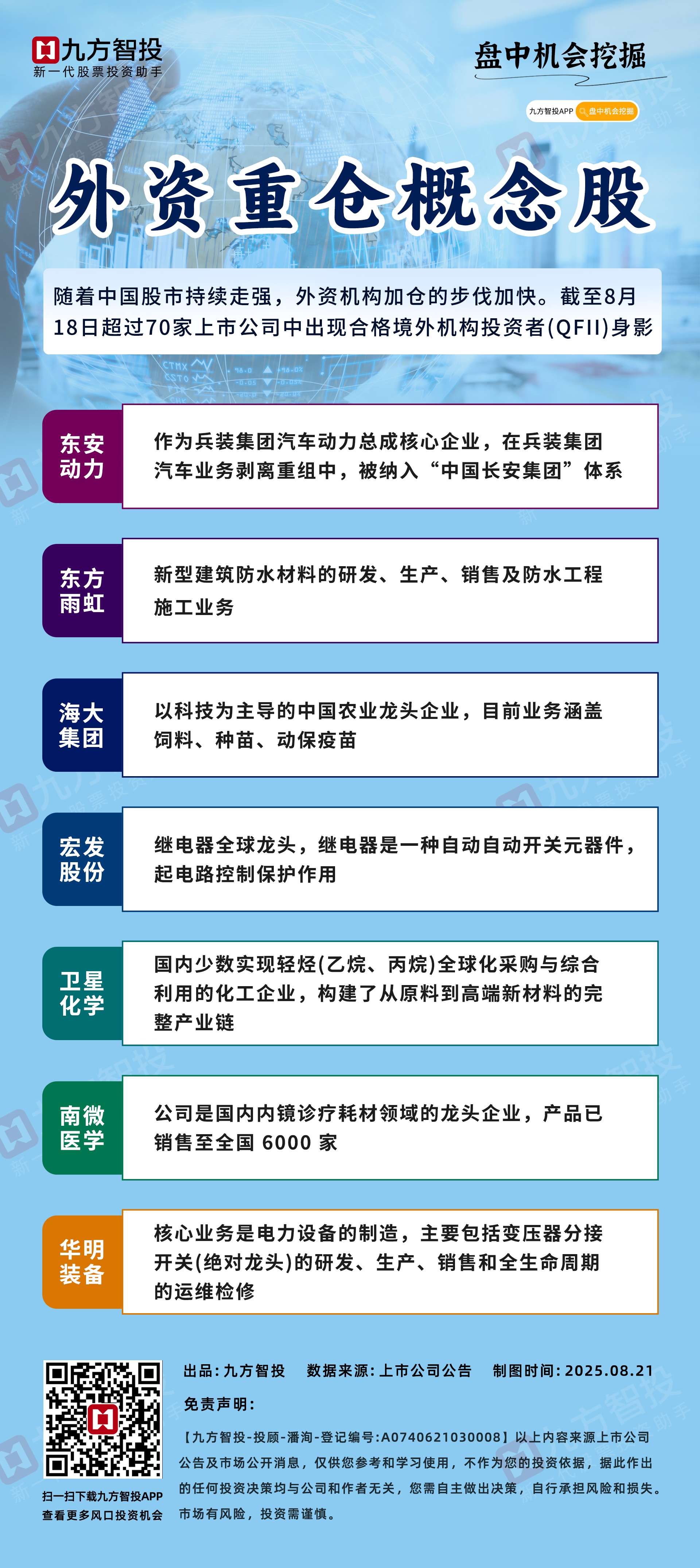 今日题材挖掘:随着中国股市持续走强,外资机构加仓的步伐加快。截至8月18日超过70家上市公司中出现合格境外机构投资者(QFII)身影(外资重仓概念股);