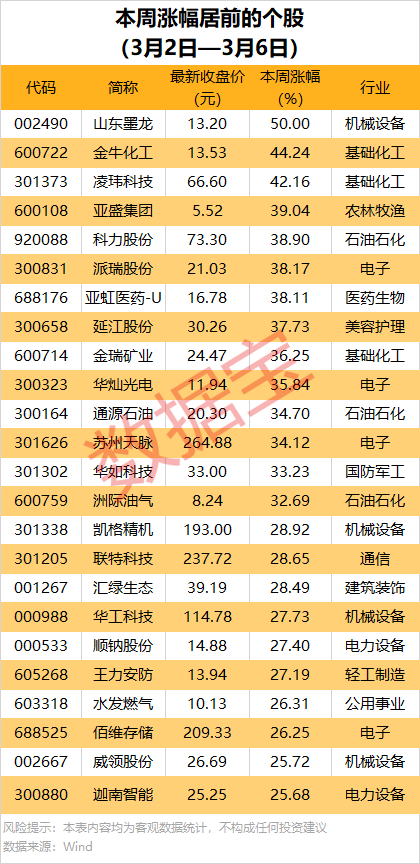 据证券时报·数据宝统计,个股方面,本周超1200股上涨,38股涨幅在20%及以上。其中,涨幅最大的是油气股山东墨龙,累计上涨50%;金牛化工、凌玮科技和亚盛集团等累计涨幅均在30%以上。