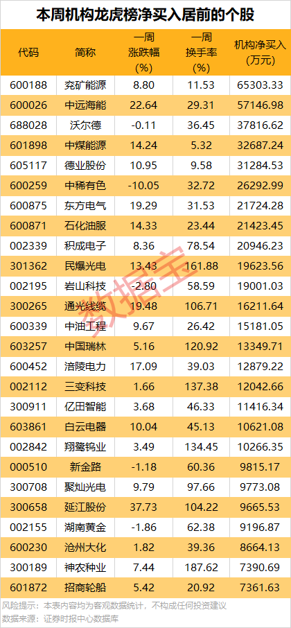 龙虎榜数据显示,本周机构专用席位共现身169股龙虎榜,净买入71股,净卖出98股。其中,57股获机构净买入均超千万元,兖矿能源、中远海能等19股机构净买入金额均超1亿元。