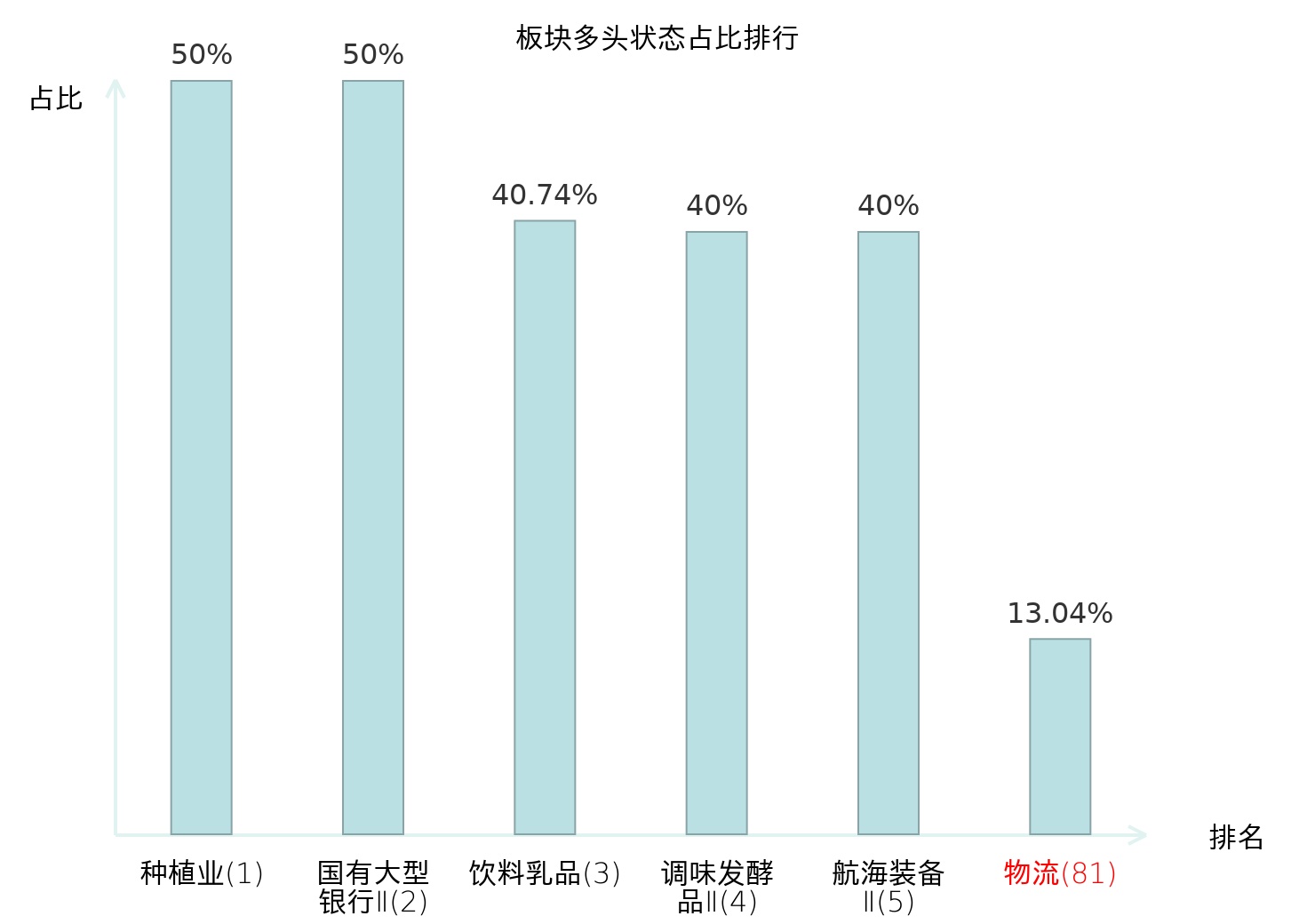 全市场所有行业板块中主力多头状态占比排名中,种植业板块位居第一。冶钢原料板块名次提升最快,较昨日上升89位。