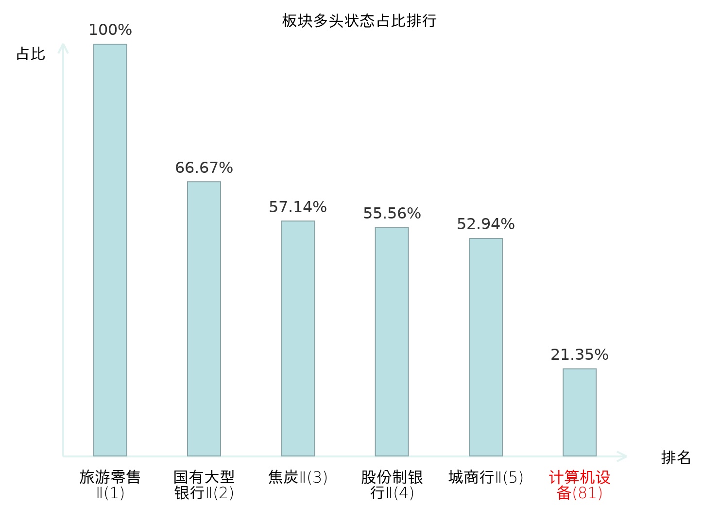 全市场所有行业板块中主力多头状态占比排名中,旅游零售Ⅱ板块位居第一。其他家电Ⅱ板块名次提升最快,较昨日上升101位。