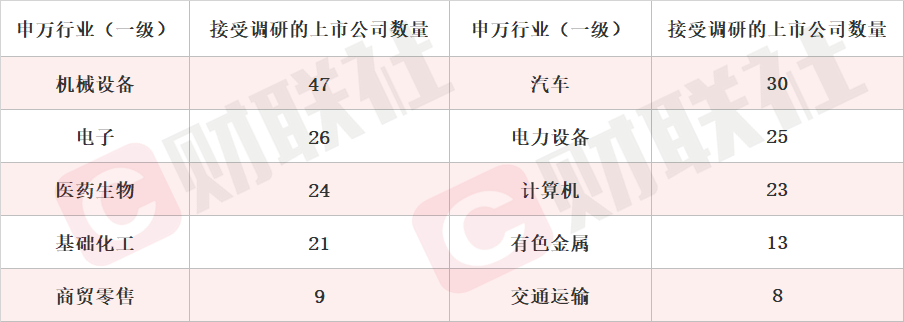 财联社9月28日讯(编辑 宣林)据Choice数据统计,截至周日,沪深两市本周共308家上市公司接受机构调研。按行业划分,机械设备、汽车和电子行业接受机构调研频度最高。此外,有色金属、商贸零售等行业关注度有所提升。