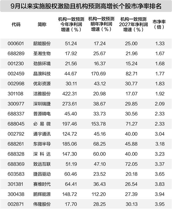 部分个股未来业绩有望高成长。数据显示,35只个股机构一致预测今年、明年及2027年净利润增速均超15%。其中低估值股票值得重点关注。从市净率角度来看,韶能股份估值最低,仅为1.33倍。