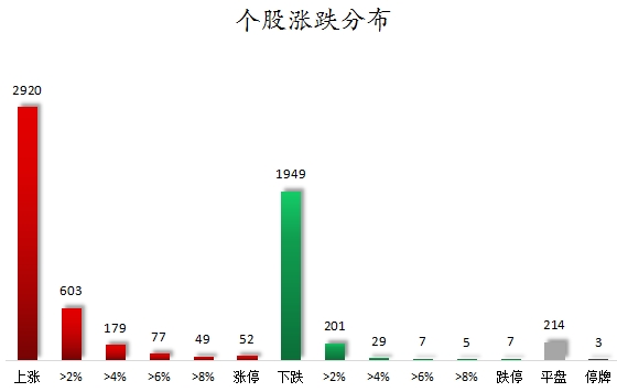 截至收盘,沪深两市合计2920个股上涨,1949只个股下跌,平盘个股214只,停牌的个股3只。不含当日上市新股,共有52只个股涨停,7只个股跌停。从连续涨停天数看,连续涨停天数超过2天的个股有11只。其中,文投控股、四川金顶均已连收5个涨停板,连续涨停板数量最多。