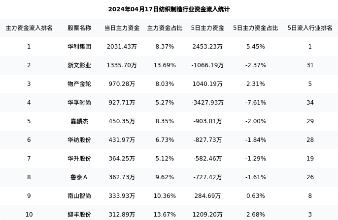 从主力资金流向来看,纺织制造行业今日主力资金流入5.07亿元,在所有申万二级行业中排名:9/131。