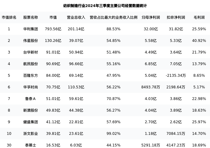 泰慕士最新报告期数据为三季度,下表汇总了纺织制造行业内市值靠前的公司三季度主要经营数据