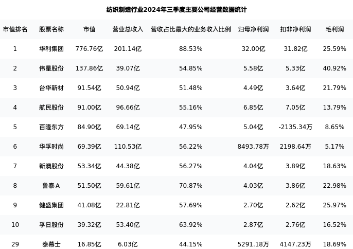 泰慕士最新报告期数据为三季度,下表汇总了纺织制造行业内市值靠前的公司三季度主要经营数据