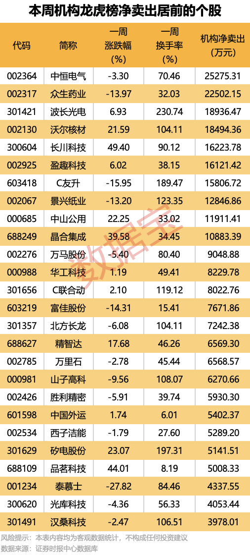 一周机构累计净卖出的个股中,10股金额均超1亿元,其中净卖出金额最多的是中恒电气,机构净卖出2.53亿元。该股本周累计下跌3.3%,周换手率为70.46%,因日振幅值达16.42%、日振幅值达15.49%、日跌幅偏离值达-8.46%等3次上榜龙虎榜,买卖居前营业部中机构合计净卖出2.53亿元;同时上榜的还有深股通专用席位,净卖出1.52亿元。