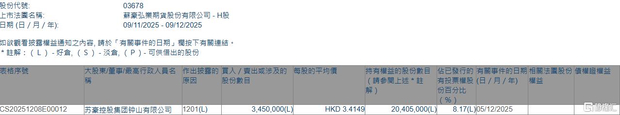 弘业期货(03678.HK)遭苏豪控股集团钟山有限公司减持345万股